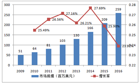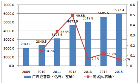 2009-2015 年中國廣告市場規(guī)模及同比增速