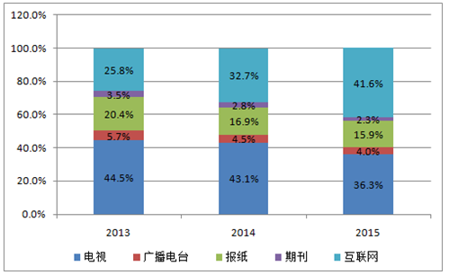 分結(jié)構(gòu)看,報(bào)紙、期刊、廣播電臺、電視等傳統(tǒng)廣告市場份額不斷被互聯(lián)網(wǎng)廣告擠壓,互聯(lián)網(wǎng)廣告市場份額接近 50%。2015 年,互聯(lián)網(wǎng)廣告市場份額達(dá)到 41.6%,相比 2014 年提高了 8.9 個百分點(diǎn),報(bào)紙、期刊、廣播電臺和電視廣告市場份額不斷下降,2015 年市場份額分別為 15.9%、2.3%、4%和 36.3%。電視廣告雖然市場份額下降,但仍是中國廣告市場上重要一環(huán),占比超過三分之一。