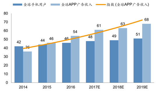 全球 APP 廣告市場規(guī)模持續(xù)擴(kuò)大,全球手機(jī)用戶穩(wěn)定增長,帶來更多行業(yè)機(jī)會。2016年全球手機(jī)用戶達(dá)到46億,全球APP廣告收入達(dá)到54億,同比增長17.4%。從各個國家應(yīng)用推廣費(fèi)用看,2016 年美國市場應(yīng)用推廣費(fèi)達(dá)到 284 億,中國市場以 139 億的市場規(guī)模緊隨其后。